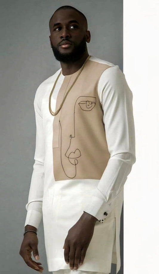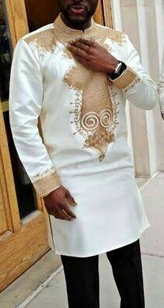 MG White Men's Traditional African Suit with Velvet Lion Throw/ Kafka, African Suit T2545