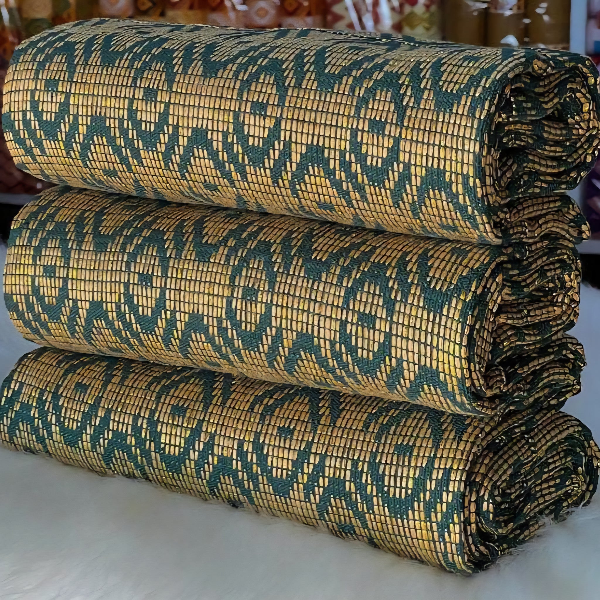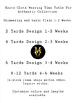 This fabric is the original Kente cloth and we cut no corners as many do to raise their profit by using a cheaper china thread that has flooded the market, where as we offer a guarantee for the real fabric and unlike many others, you get the design you see in the image and not something one may think is similar as we boost having the top weavers and designers in Ghana.