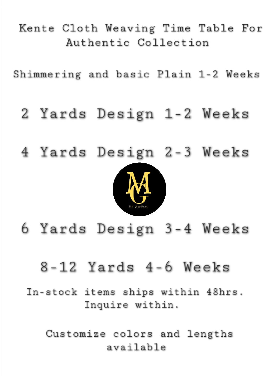 This fabric is the original Kente cloth and we cut no corners as many do to raise their profit by using a cheaper china thread that has flooded the market, where as we offer a guarantee for the real fabric and unlike many others, you get the design you see in the image and not something one may think is similar as we boost having the top weavers and designers in Ghana.
